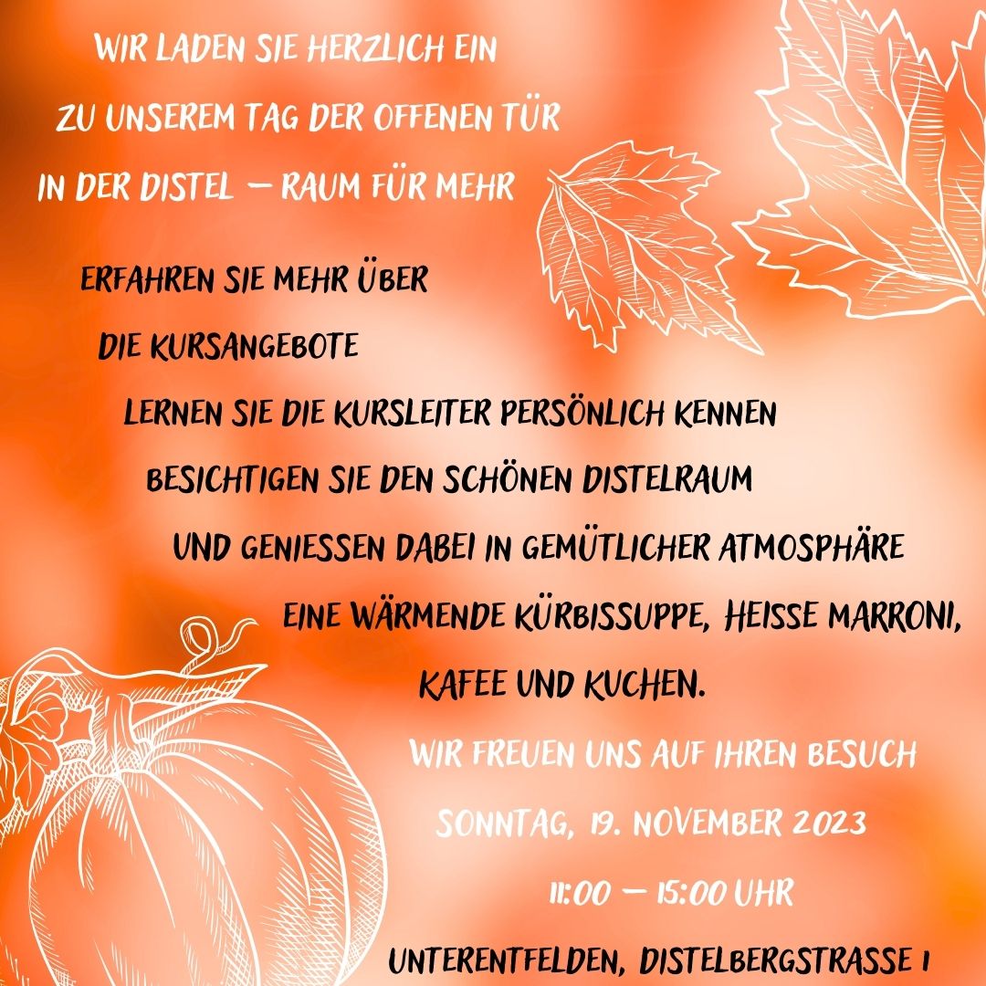 erfahren sie mehr über die kursangebote, lernen sie die kursleiter persönlich kennen und besichtigen sie den schönen distelraum. dabei geniessen sie in gemütlicher atmosphäre heisse maroni oder eine wärmende kürbissuppe.